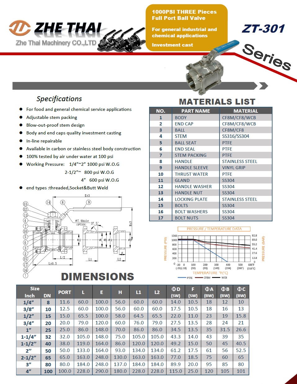 × 1000PSI Three Piece Full Port ball valves 1000PSI Three Piece Full Port ball valves Model:ZT-301 Add to cart Country of Origin:Taiwan About This Product